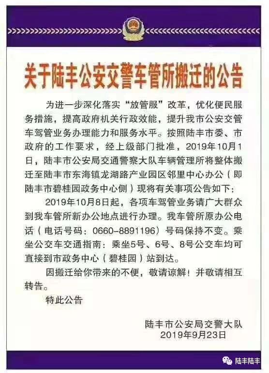 关于陆丰公安交警车管所搬迁的公告